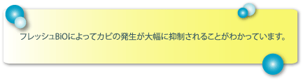 この試験では、フレッシュ BiO を天井に設置した部屋(実験区)と設置していない通常の部屋(対象区)に、それぞれ培地(カビのエサとなるもの)を、経過日ごとに30分間ずつ放置してはその都度カビの培養を行ない、落下菌の数を測定したものです。培地は毎日新しいものを使用したところ、バイオを設置した実験区のほうは日ごとに落下菌数が減っていくのが確認されました。このことは、 フレッシュ BiO にはカビ発生を抑える力が働いている ことを示しています。