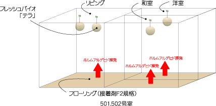実験方法: マンションのフローリングにホルムアルデヒドを多量に含む接着剤を使用した部屋と使用していない部屋を用意し、使用した部屋の中でもフレッシュ BiO 「テラ」を使用した部屋と使わない部屋を設け、 10 日後に比較した。